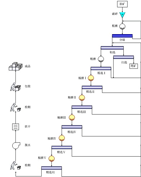 開采的礦石先由顎式破碎機(jī)進(jìn)行初步破碎,在破碎至合理細(xì)度后經(jīng)由提升機(jī),給礦機(jī)均勻送入球磨機(jī),由球磨機(jī)對礦石進(jìn)行粉碎、研磨。經(jīng)過球磨機(jī)研磨的礦石細(xì)料進(jìn)入下一道工序:分級。 螺旋分級機(jī)借助固體顆粒的比重不同而在液體中沉淀的速度不同的原理,對礦石混合物進(jìn)行分級。 A、經(jīng)過和分級的礦物混合料在經(jīng)過磁選機(jī)時,由于各種礦物的比磁化系數(shù)不同,經(jīng)由磁力和機(jī)械力將混合料中的磁性物質(zhì)分離開來。 B、經(jīng)過和分級的礦物混合料在經(jīng)過磁選機(jī)時,由于各種礦物的比磁化系數(shù)不同,經(jīng)由磁力和機(jī)械力將混合料中的磁性物質(zhì)分離開來,通過攪拌筒將選礦物質(zhì)被分離出來后,因其含有大量水分,須經(jīng)濃縮機(jī)的初步濃縮,再經(jīng)烘干機(jī)烘干,即可得到干燥的礦物質(zhì)。