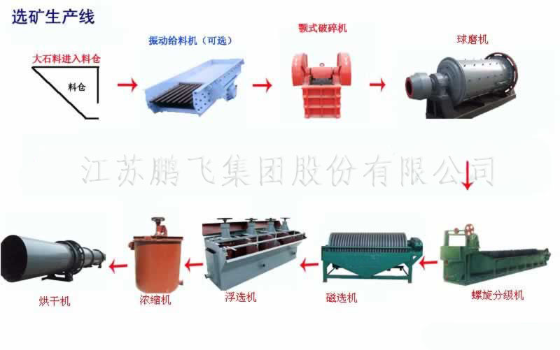開采的礦石先由鄂式破碎機(jī)進(jìn)行初步破碎,在破碎至合理細(xì)度后經(jīng)由提升機(jī)、給礦機(jī)均勻送入球磨機(jī),由球磨機(jī)對礦石進(jìn)行粉碎、研磨.經(jīng)過球磨機(jī)研磨的礦石細(xì)料進(jìn)入下一道工序:分級.螺旋分級機(jī)借助固體顆粒的比重不同而在液體中沉淀的速度不同的原理,對礦石混合物進(jìn)行洗凈、分級.經(jīng)過洗凈和分級的礦物混合料在經(jīng)過磁選機(jī)時,由于各種礦物的比磁化系數(shù)不同,經(jīng)由磁力和機(jī)械力將混合料中的磁性物質(zhì)分離開來.經(jīng)過磁選機(jī)初步分離后的礦物顆粒在被送入浮選機(jī),根據(jù)不同的礦物特性加入不同的藥物,使得所要的礦物質(zhì)與其他物質(zhì)分離開.在所要的礦物質(zhì)被分離出來后,因其含有大量水分,須經(jīng)濃縮機(jī)的初步濃縮,再經(jīng)烘干機(jī)烘干,即可得到干燥的礦物質(zhì).
